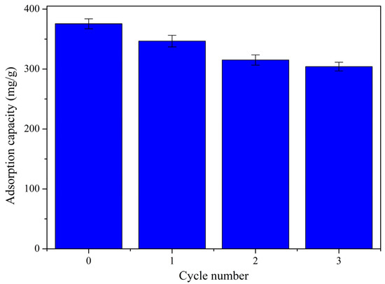 For economic reasons, the exhausted adsorbent is required to be reused by a practical regeneration method [55]. The adsorption of phosphate onto MTPG was basically decayed at higher pH, thus sodium hydroxide solution may be efficient to phosphate desorption from the saturated adsorbent [31]. The regeneration of MTPG which went through the circle of regeneration is unveiled in Figure 5. It is apparently seen that the phosphate adsorption density gradually declines with a rise of the cycle sequence. After the third regeneration cycle, the adsorptive quantities in Figure 5 were obviously reduced from 375.46 mg/g to 304.05 mg/g, with the regeneration ratio of 80.98%. This finding proved that after regeneration, the reusability of MTPG was still feasible [31]. In particular, the MTPG was confirmed to possess great advantages on magnetic recovery and reused characteristics by employing a rapid sodium hydroxide regeneration method.