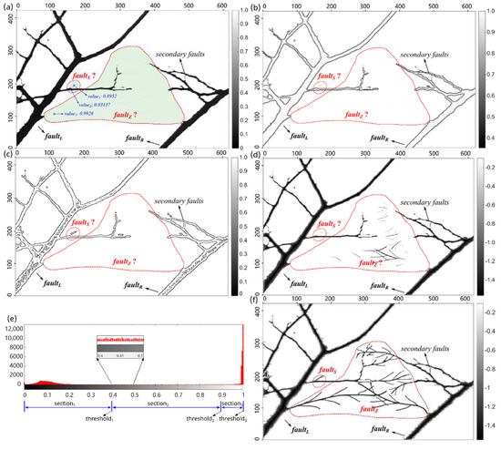 The faults of different scales usually lie within different value ranges of the coherence. The histogram of the coherence (Figure 2a) is presented in Figure 2e. It can be roughly divided into 3 sections, where section1 is [0,0.4], section2 is [0.4,0.9], and section3 is [0.9,1.0]. By the definition of coherence, it can be inferred that section1 is the low value region and reveals the main faults. Section 2 is the medium value region and represents secondary faults. Section 3 is the high value region and depicts the homogeneous geological background and tiny faults. The three scattered values in Figure 2a show this phenomenon.