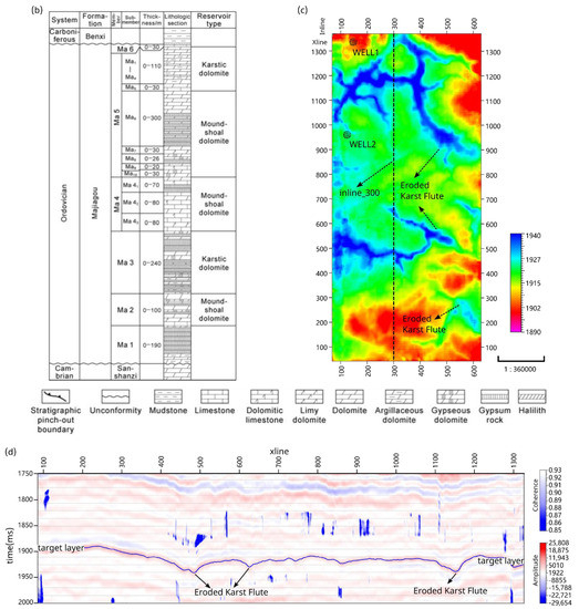 The Majiagou Formation, the object of this study, generally distributed in the central-eastern Ordos Basin, China, is in the survey X on the Yishan slope in the east of the central paleo-uplift of the basin (red frame box shown in Figure 3a). The Ordovician reservoirs in this area are mainly marine carbonate deposits, which are one of the major natural gas reservoirs in the basin. The precious analysis of present tectonics and ancient landform shows that the structure of the Majiagou Formation, controlled by the paleo-morphology at the bottom of the Ordovician System, has the characteristics of tectonic inheritance development. The Majiagou Formation is divided into six members from Ma1 to Ma6. The Ma2 member composed of mound-shoal dolomite is our target (shown in Figure 3b). The low amplitude tectonics are developed throughout the Ma2 member and the highest position is located in the central-eastern, with no regional large faults but tiny faults generally developed (shown in Figure 3c,d). Additionally, three eroded karst flutes are located in the northern, southern, and central parts of the work area, with pore caves and fractures.