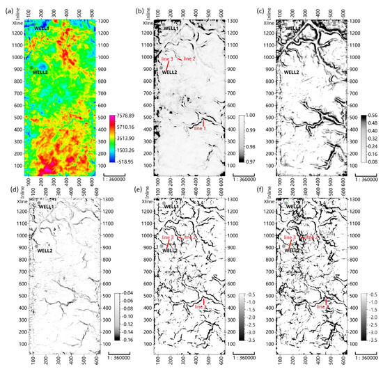 Figure 3 also shows the initial interpretation results of the target stratum, where Figure 3c is the structure map of time domain, Figure 3d is its amplitude and coherence of inline 300 (black-dashed line in Figure 3c). On the whole, our target stratum is located in a low-amplitude tectonics area with reflected time ranged from 1855 ms to 1938 ms. The eroded karst flutes are very distinguished in the structure map. The coherence presents some rough sketches of the three eroded karst flutes but cannot provide any details of tiny faults around them. Compared with the discontinuities in the base map, the fault features in the vertical profile are weaker (shown in Figure 3d). If we continue to intensify the thresholding, even if we may get some fault features near the flutes, we will end up with a blurry image. Next, typical property slices of the target layer were extracted for comparison and the improvement of the new method in fault detection is discussed.