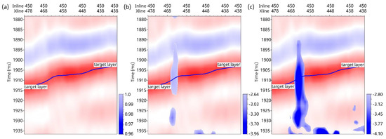 Next, some further comparisons were implemented in seismic profiles to verify the authenticity of these fault-like features (shown in Figure 5, Figure 6 and Figure 7). The profiles of coherence, PC attribute, and the result of the new method in three arbitrary lines (line 1, line 2, and line 3) are extracted. They are displayed with amplitude in the same color-map scheme. For the three lines, the coherence, the results of PC, and the new method all present a similar pattern. The discontinuities gradually increase near the locations where the strata underwent weak undulations. Obviously, the new method reached the highest resolution. The hanging and foot wall of a fault are different in spatial location. When the fault displacement is large, the walls are expressed as travel time differences on the reflection seismic profile on both sides of the fault. When the displacement is small, the walls presented themselves as amplitude variation mainly. The undulation of the strata and the variation of the amplitude presented Figure 5a, Figure 6a and Figure 7a are weak but visible, and their enhanced results in (b) and (c) are reliable with high probabilities.
