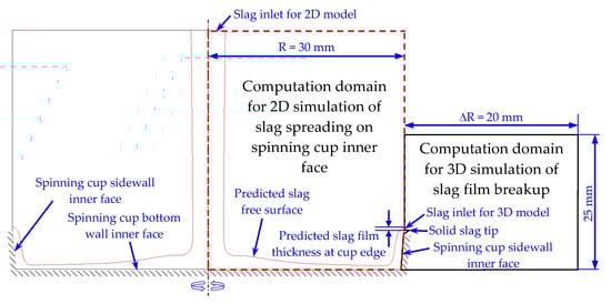 In the present modeling work, the slag inlet conditions (including slag film thickness and slag flowrate) were calculated using the two-dimensional (2D) CFD model previously developed for simulating the spreading process of molten blast furnace slag on the inner wall of the spinning cup [19]. Figure 1 schematically illustrates the computation domain of the two-dimensional CFD model established previously and that of the three-dimensional (3D) model developed presently, as well as how the former model simulation results (i.e., slag film thickness at the spinning cup edge) are introduced into the latter model.