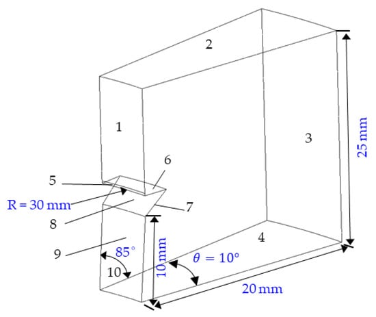 Three-dimensional illustration of the computation domain defined in the present CFD model for simulating slag film breakup into droplets. 1, 2, 3, and 4: pressure outlets; 5: slag inlet; 6: upper face of the solidified slag tip; 7: lower face of the solidified slag tip; 8: the solidified slag tip; 9: inner face of the spinning cup sidewall; 10: angle between the spinning cup sidewall and horizontal plane.