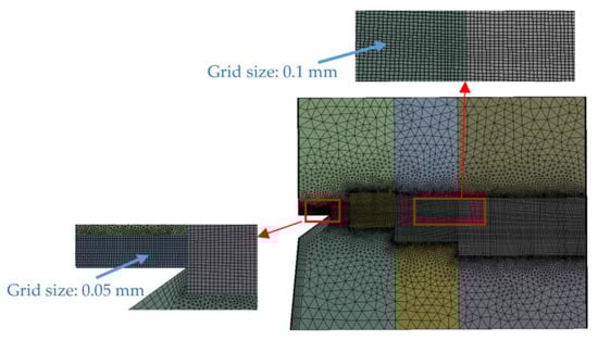 Figure 3 is a two-dimensional representation of the computation mesh generated using the meshing tool of ANSYS Workbench platform [21] for the present three-dimensional CFD model. This figure shows the grid divisions on the central vertical plane in the radial direction of the computation domain. The three-dimensional computation mesh is comprised of approximately 1.3 million grids. The region in which the slag ligaments and droplets are formed employs a structured mesh with grid sizes ranging from 0.05 mm to 0.1 mm, whereas the rest of the regions use unstructured meshes with a maximum grid size of 1 mm.