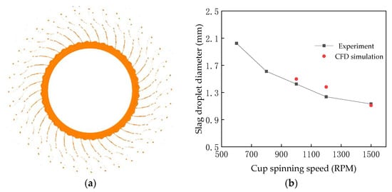 Comparison of CFD simulation results with experimental measurements reported in the literature. (a) CFD model simulated breakup process of molten slag with a spinning cup. (b) Comparison of slag droplet diameter predicted by CFD model and those measured in experiment [25].