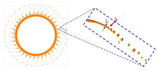 In the process of centrifugal granulation of molten slag, the liquid film can be disintegrated into droplets in three modes: (i) direct droplet formation, (ii) ligament formation and breakup, and (iii) sheet formation and breakup [8]. Among them, the mode of ligament formation and breakup has received the most attention owing to the production of droplets with both a smaller average size and narrower size range [9]. Wu et al. [10] investigated the impact of liquid viscosity on granulation using a mixture of water and glycerol. Their findings demonstrate that a change in granulation mode is caused by an increase in fluid viscosity, and that the droplet shape is more spherical in the ligament breakup mode. Mizuochi et al. [11] explored the effects of spinning cup configuration, slag viscosity, and gas flowrate on the shape and size of granulated particles by performing high-temperature slag granulation experiments. They discovered that the long-end diameter of slag particles was greatly affected by air flow and surface tension. Wegener et al. [12] studied the ligament disintegration of molten slag in a natural state (without external vibration) at a high temperature and quantitatively described the process of molten slag breakup into droplets. In addition to experimental research, numerical simulation and theoretical analysis methods were also used to study the process. Purwanto et al. [13] established a numerical model of centrifugal granulation, which can be used to calculate the thickness of slag film, the number of liquid ligaments at the edge of the spinning cup, and the diameter of the produced droplets. Wang et al. [14,15] proposed a simple model to characterize the ligament mode disintegration of liquid slag film and a ligament spacing model for viscous liquids. According to their research results, the number of liquid ligaments grew as the rotational speed increased, but reduced when viscosity and surface tension increased. Liu et al. [2,9] used experimental data to develop a dimensionless correlation that was applied to theoretically calculate droplet diameter based on the force balance at the liquid ligament’s end. They found that the droplet size for the ligament formation and disintegration mode depended on the diameter of the tip at the end of the ligament.