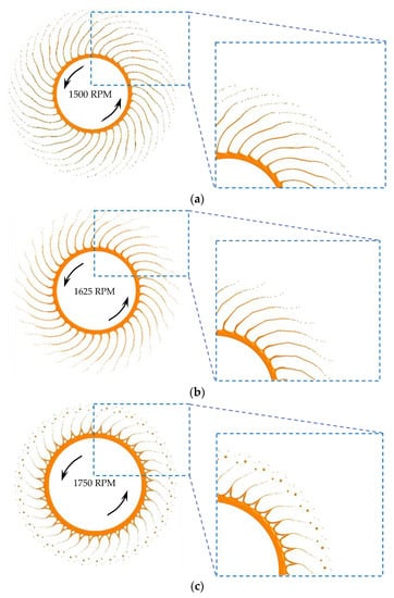 In the entire process of centrifugal granulation of molten slag using a spinning cup, one of the most important and easily adjustable operating parameters is the cup spinning speed. Numerous research works have demonstrated that increasing the cup spinning speed is helpful for obtaining smaller-sized slag droplets. To study how the spinning speed affects the diameter of the slag ligament and the diameter of the droplets, as well as the correlation between the ligament diameter and the droplet diameter, CFD simulations were carried out with the cup spinning speed set at 1500 RPM, 1625 RPM, 1750 RPM, and 2000 RPM for the same slag flowrate of 3 kg min−1 (c.f., Table 2). Figure 6 illustrates the simulation results showing the breakup process of molten slag driven by a spinning cup operated under the above-mentioned conditions. It can be seen from local enlargements of this figure that the CFD simulation results do reveal that the slag is granulated in ligament disintegration mode for all cup spinning speeds and, as the cup spinning speed rises, the number of liquid ligaments around the cup periphery increases, and the ligament diameter and droplet diameter all decrease.