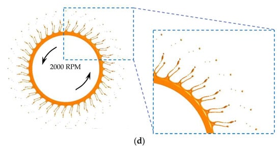 - Dombrowski, N.; Lloyd, T. Atomisation of liquids by spinning cups. Chem. Eng. J. 1974, 8, 63–81. [Google Scholar] [CrossRef]