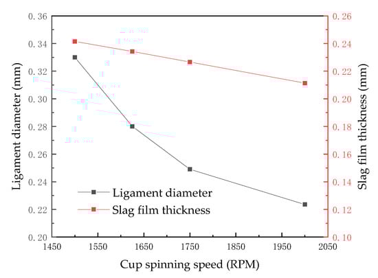 Effect of cup spinning speed on slag film thickness at the cup edge and slag ligament diameter.