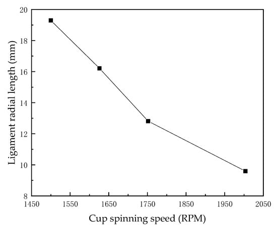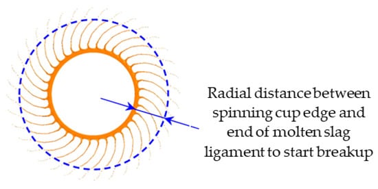 As seen from Figure 6, under the influence of the centrifugal force, the molten slag ligaments are curved, such that it is hard to accurately determine the ligament length. Instead, in order to examine the effect of the cup spinning speed on the ligament length, a radial distance between the spinning cup edge and the position at which the ligament starts to break into droplets (i.e., the end of the ligament) is defined in the present work, as shown in Figure 9. This radial distance is proportional to the ligament length, so it reflects the ligament length, and thus is termed the ligament radial length. Figure 10 depicts how the ligament radial length is influenced by the cup spinning speed. As the cup spinning speed increases, the ligament radial length decreases. This is because a higher cup spinning speed leads to a decreased slag film thickness at the cup edge, producing thinner ligaments, an increased slag flow velocity in each ligament, a larger frequency of “neck” appearance on the ligament, and thus an earlier start of breakup of the ligament at a shorter radial distance, all of which result in a shorter ligament length.