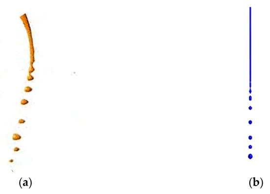 As an example, a molten slag ligament formed by a spinning cup with a cup spinning speed of 1750 RPM is selected from the CFD simulation results (Figure 6c) to compare its breakup process to the breakup process of a water ligament under gravity previously simulated by a CFD model [27]. The comparison result is shown in Figure 11. It can be seen from this figure that the breakup process of a molten slag ligament in centrifugal granulation using a spinning cup looks very similar to that of a water ligament under gravity. It is well known that, in the latter case, the mechanism of a water ligament breakup into droplets closely follows the law of the Rayleigh disintegration mechanism. Therefore, it may be inferred that the mechanism of breakup of a molten slag ligament into droplets driven by the centrifugal force should also approximately obey the Rayleigh disintegration mechanism. Both breakup processes exhibit the development of disturbance waves on the surface of the ligaments and the propagation and amplification of the waves cause a series of “necking” in the ligaments that eventually leads to the disintegration of the ligaments at the “necks”, forming a string of droplets.