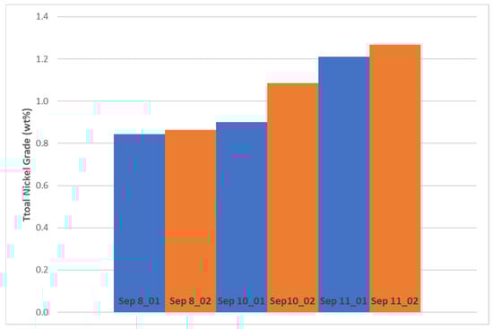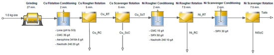Before starting the laboratory flotation test, process water pH was adjusted to 9.5 by lime addition. All tests were carried out at a temperature of 20 °C. Prior to flotation, the test feed batch was ground in a laboratory mill at 70% solids for 27 min. The tests were performed using an Outotec GTK LabCell flotation machine with a 2 L flotation cell. The rotor mixing speed was 1300 rpm and air feed rate 5 NL/min. The slurry was first conditioned for two minutes with 35 g/t CMC, 5 g/t Aerophine 3418A and 20 g/t Nasfroth 240 reagents. After that, copper rougher-scavenger flotation was carried out for 10 min. Copper scavenger tailings were conditioned again with 15 g/t CMC, 50 g/t SIPX and 10 g/t Nasfroth 240 reagents for two minutes before recovering the nickel rougher concentrate during 7.5 min of flotation. After another conditioning of slurry with 30 g/t SIPX for two minutes, nickel scavenger flotation was performed for 7.5 min.