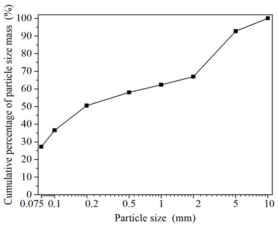 The RE specimens selected in this study were taken from an RE ore in Longnan County, Ganzhou. A number of RE ore samples were taken by the ring-knife method, then sealed by cling film, and the physical parameters of the mineral soil were measured according to the geotechnical test procedure. The results are shown in Table 1. According to the Geotechnical Test Procedure, the sieving method for gravel soil containing clay particles, named the water sieve method, the soil samples were air-dried and crushed, 500 g of mineral sample was taken out for sieving experiment using the quarter diagonal sampling method, and the grain size of the sieve were 5, 2, 1, 0.5, 0.2, 0.1, 0.075 mm in order. The results of particle size distribution of the mineral sample are shown in Figure 1, which can be judged as coarse-grained sandy soil. In this test, MgSO4 solution and DI water were used as leaching agents, and three groups of 2.0% and 5.0% MgSO4 solution and DI water were prepared for the indoor column leaching test. The corresponding mass of MgSO4 particles was weighed and dissolved in DI water with an electronic balance to obtain the corresponding mass percent concentration of MgSO4 solution.
