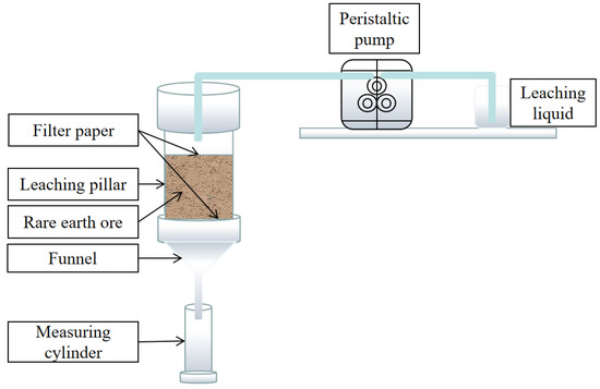 The experimental method used in this study was mainly an indoor simulated column leaching method for ionic RE ore, and was strictly implemented with reference to the standard of remodeled soil samples, so that the physical parameters of the remodeled soil were as consistent as possible with the original RE ore. Figure 2 shows the indoor simulated column leaching experimental device. The inner diameter of the selected acrylic tube was 44 mm, the thickness of the tube wall was 2 mm, and the diameter to height ratio of the remodeled soil sample was 44:60 according to the effective area detected by NMR. The leaching of ion-adsorbed RE ores with different concentrations of MgSO4 solution leachant (2.0% and 5.0% mass percent concentration) and DI water was studied in indoor simulated leaching. In the process of leaching, a large number of ion exchange reactions occur within the ionic RE ore, and this process is a dynamic desorption process. The test procedure was to use indoor simulated column leaching method. While using a peristaltic pump to adjust the liquid injection flow rate, the leached mother liquor was collected at the end of each leaching to obtain the required data. The concentration of RE ions in the collected leached mother liquor was determined by using the EDTA volumetric method. During the leaching process, the ion-exchange reaction between Mg2+ in the solution and RE3+ in the RE ore sample resulted in a change in the thickness of the sliding layer on the surface of the RE ore sample particles. According to the theory of the diffusion electric double layer model, the Zeta potential of the colloidal particles was measured by using a Zeta probe potential analyzer from American Colloidal Dynamics (Ponte Vedra Beach, FL, USA). The Zeta potential is usually used to characterize the stability of a colloid [29], which reflects the state of adsorption and desorption of colloids and ions. An NM-60 magnetic resonance rock micro-structure instrument (NM-60, Suzhou Niumaga Analytical Instrument Corporation, Suzhou, China) was selected as the pore structure test of the leached specimens. By using NMR technology, the pore structure parameters of the specimens could be determined quickly and nondestructively, and the T2 distribution curve and porosity of each leached specimen could be obtained. By analyzing the porosity and different pore size distribution of the samples in the column leaching experiment stage, the evolution process of the internal pore structure in the column leaching process could be analyzed dynamically from the microscopic perspective.