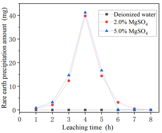 (1) By comparing the leaching process of DI water, 2% MgSO4 and 5% MgSO4, it was found that DI water leaching did not involve chemical reactions, and no RE ions were leached during the whole leaching process. In the process of MgSO4 as the leaching solution, the leaching amount of RE ions first increased and then decreased. The effective leaching time was gradually shortened as the concentration of MgSO4 leaching solution increased, indicating the higher the concentration of leaching solution, the more obvious the chemical replacement effect, which provides a certain basis for rare earth leaching efficiency.