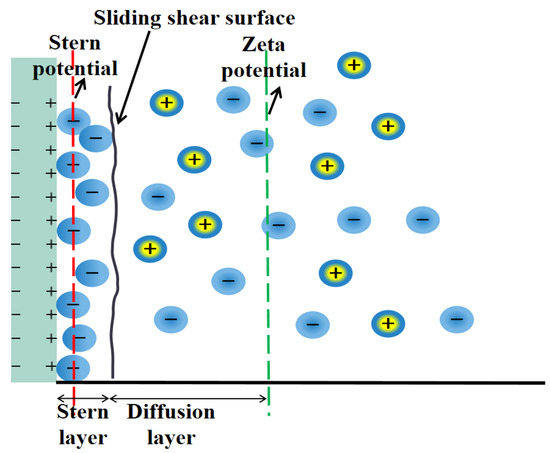 The mechanism of pore structure evolution is actually the deposition and release of particles on the pore structure of the ore body. The double electric layer structure generated during the ion exchange reaction causes inter-particle interaction forces, resulting in the deposition and release of fine particles within the ore body, which in turn produces dynamic pore structure evolution. The pore structure change caused by Zeta potential change was analyzed from the microscopic point of view. Since the RE ore body has a large number of negative charges, equal amounts of positive charges of different sign must exist around the particles to achieve overall electrical neutrality. Due to the electrostatic attraction of the surface negative charge, the anti-ions tend to gather on the particle surface. At the same time, due to the thermal movement of the ions, the ions tend to be evenly distributed in the solution. Finally, a special structure, namely a diffusion double electric layer, appears near the ore body surface. The surface charge of the dispersed particles attracts the surrounding counter ions, which are distributed in a diffuse state at the interface of the two phases. According to DLVO (Derjaguin-Landan-Verwey-Overbeek) theory, these phenomena are well established and reviewed based on classical DLVO theory. The electric double layer can be divided into two parts, i.e., the Stern layer and diffusion layer. The model of electric double layer structure is shown in Figure 5.