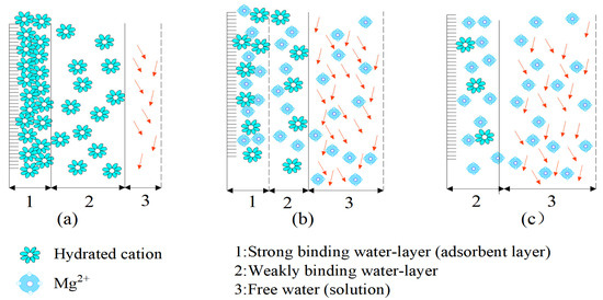 Due to van der Waals force and electrostatic repulsion, the first layer of cations are strongly bound to the surface of the adsorption layer, constituting the compact layer of the electric double layer. The cations outside the compact layer can diffuse to the fluid body due to the concentration difference, which in turn forms the diffusion layer of the electric double layer. The diffusion layer is controlled by electrostatic forces and concentration difference diffusion, the interface between the compact layer. The diffusion layer is called the sliding shear surface. The potential at that point to a point in the fluid away from the interface is called the Zeta potential. The Zeta potential is the potential difference between the continuous phase and the stable layer of fluid attached to the dispersed particles, which can be directly determined by a Zeta potential meter. The electric double layer structure plays a key role in particle interactions and interfacial phenomena. While the sliding layer thickness is an important parameter in diffusion electric double layer, it refers to the distance from the sliding surface to the particle surface, which has an important effect on the generation of numerous interfacial processes such as particle stability. The electric double layer structure can be used to analyze the process of gradual change of the strong and weak bound water layer [30]. When the RE ore is leached with DI water, a large number of hydrated cations are adsorbed, and a strong bound water layer is formed due to the electric field generated between the mineral particles. The strongly bound water layer hinders the percolation of DI water, so the permeability of DI water in the ore body is small, as shown in Figure 6a. When leaching with 2% MgSO4 solution, the presence of Mg2+ in the solution and the negatively charged material in the mineral particles form part of the new charge equilibrium, weakening the original electric field effect, resulting in a weakening of the strong binding water layer. The weakened strong binding water layer reduces the 2% MgSO4 solution in the ore body percolation obstruction, the channel of the free solution becomes larger in the percolation, and the effective pore of the ore body becomes larger (see Figure 6b). The 2% MgSO4 solution in increases the ore body permeability more than the DI water. However, when leaching with 5% MgSO4 solution, due to the increase of Mg2+ concentration in the solution, the Mg2+ concentration time is fully able to balance the negatively charged mineral particles in the mineral, so the strongly bound water layer in the ore body gradually changes into a weakly bound water layer, so that the channel of free solution in the ore body continues to increase and the effective pore space in the ore body increases (see Figure 6c). It can be seen that the change of the internal structure of the ore body is further increased when leaching with 5% MgSO4 solution, the corresponding permeability increased and the effective pore space increased, which accords with the later pore structure experimental results of NMR.