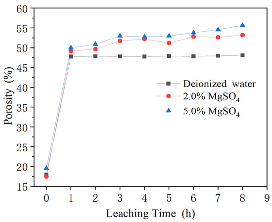 Variation of porosity of specimens in different concentrations of MgSO4 and DI water leaching solution with leaching time.