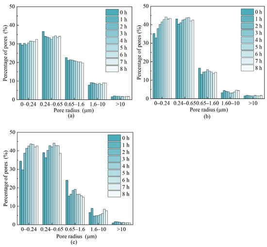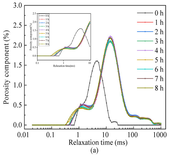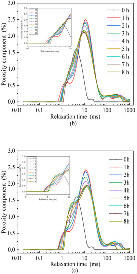 The pore radius in microns (μm) refers to the maximum radius of the sphere that can pass through the pore throat. The size and percentage distribution of the pore radii are closely related to the pore structure. The larger the pore radius, the better the connectivity of the pore space. Pore radii of different sizes as a percentage of the total pore reflect the pore radius distribution in different leaching time periods. According to the range of measured values of pore radius, the pore size is divided into five major categories: a pore with a size range of 0–0.24 μm is called a minimal pore; a pore size range of 0.24–0.65 μm is called a small pore; a pore size range of 0.65–1.6 μm is called a medium pore; a pore size range of 1.6–10 μm is called a large pore, and a pore with a radius greater than 10 μm is called a mega pore. The distribution of different pore sizes was calculated by T2 distribution curves, which are shown in Figure 9a–c. In this way, the dynamic change of each pore radius in the internal structure of the pore reflects the evolution of the pore structure of the specimen under the coupling effect of solution percolation and the ion exchange reaction.