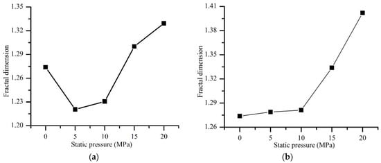 - The degree of fracturing of sandstone under the effect of PHVD can be influenced by the level of static pressure. When a low static pressure (5 and 10 MPa) is applied normally to the discharge channel, the total length and fractal dimension of cracks are less than that in specimens under no static pressure, which is detrimental to the fracture of sandstone. However, a high static pressure (15 and 20 MPa) can increase the total length and fractal dimension of cracks and promote fracturing of the sandstone. When static pressure is applied parallel to the discharge channel, the crack length and fractal dimension increase with increasing static pressure.