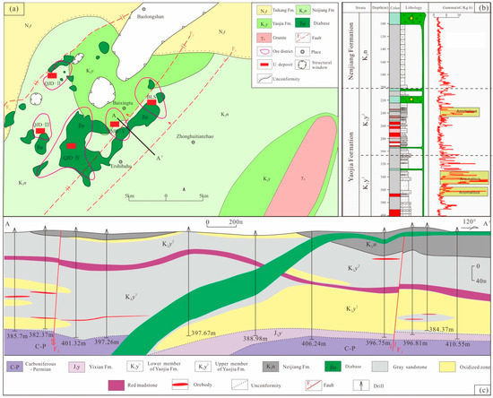 - Bonnetti, C.; Cuney, M.; Malartre, F.; Michels, R.; Li, X.; Peng, Y. The Nuheting deposit, Erlian Basin, NE China: Synsedimentary to diagenetic U mineralization. Ore Geol. Rev. 2015, 69, 118–139. [Google Scholar] [CrossRef]