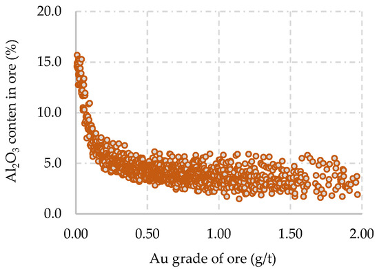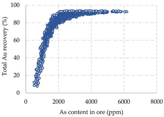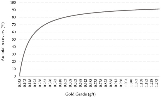 Figure 2 represents the gold recovery trend (total recovery) as a function of the gold content in the feed. The graph was obtained by applying Equation (3). It is observed that for high levels of gold (>0.90 g/t), the recovery curve does not show great gains.