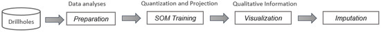 - Carneiro, C.C.; Silva Yanez, D.N.V.; Ulsen, C.; Fraser, J.S.; Antoniassi, J.L.; Paz, S.; Angélica, R.S.; Kahn, H. Imputation of Reactive Silica and Available Alumina in Bauxites by Self-Organizing Maps. In Proceedings of the 12th International Workshop on Self-Organizing Maps and Learning Vector Quantization, Clustering and Data Visualization, Nancy, France, 28–30 June 2017; WSOM: Geneva, Switzerland, 2017. [Google Scholar]
