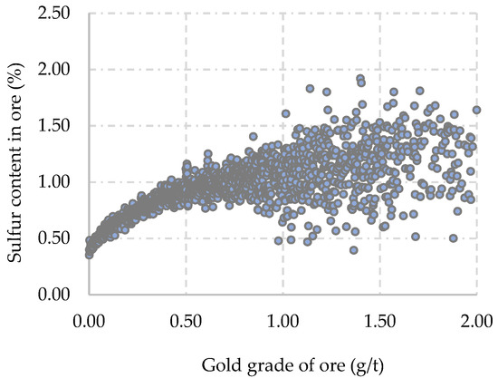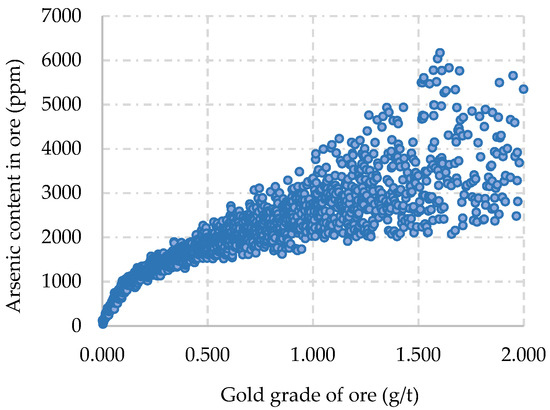 The data presented in Figure 4 and Figure 5 show a positive correlation with arsenic, sulphur, and gold contents that corroborates that the mineralogy and mineral associations of the gold in the deposit can be defined as sulphide refractory gold ore. From a flotation perspective, it is possible to evaluate the floatability of pyrite, arsenopyrite, and other sulphides, since these minerals all have different proportions of gold associated with them.
