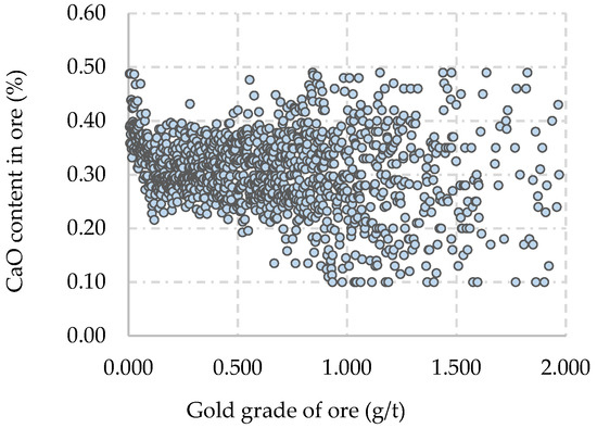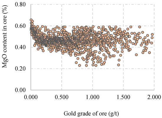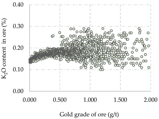 As seen in Figure 8, Figure 9 and Figure 10, K2O, MgO, and CaO do not have a very clear trend with the gold grade—a fact that can be observed in Table 2 with a low variation in potassium and magnesium contents, as described by the standard deviation. This can occur due to the generalization of the deposit composed of only one lithology (phyllite).