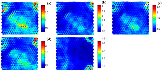 The representation of the self-organizing maps in the form of a U-matrix (unified distance matrix) in terms of Euclidean distance is presented in Figure 11, demonstrating the distance between neighbouring nodes for all attributes (chemical analysis), where the colour-temperature scale represents the similarities between adjacent nodes in blue–green and the dissimilarities in orange–red. From Figure 11, it is possible to establish relationships of similarities between samples with a more homogeneous pattern, mainly seen in Figure 11b,e.