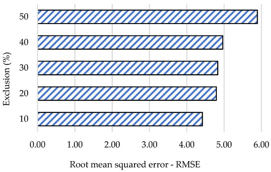 When the coefficient of determination or R2 is observed, its total variance increases considerably from the exclusion of 30% observed data, which can be explained by the model. This causes a considerable loss in adherence to the model. As for the RMSE, unlike R2, the largest deviations are above 40%, where there is a greater weight for large deviations between the original and predicted data.