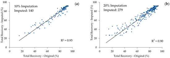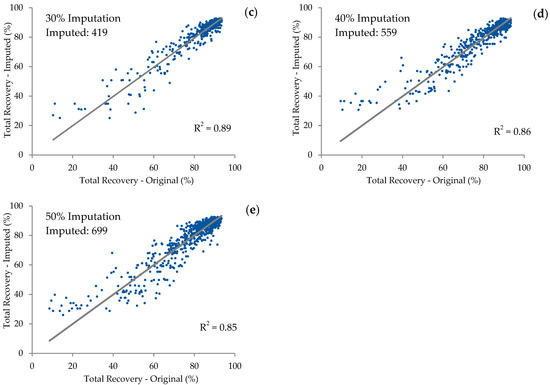 Correlation between the original and imputed total gold recovery data from (a) 10%, (b) 20%, (c) 30%, (d) 40%, and (e) 50% of sample exclusion. R2 is the coefficient of determination.