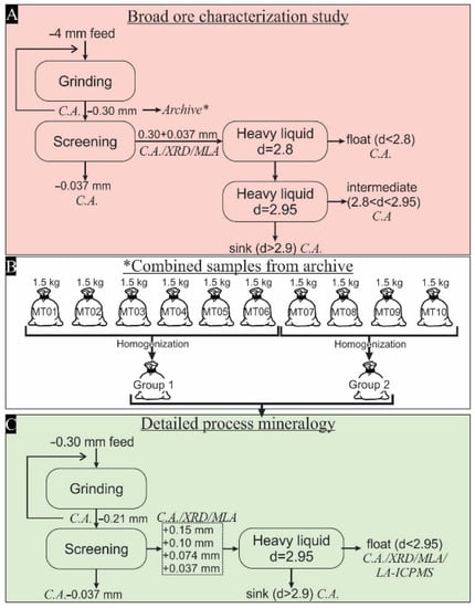 Experiment flowchart: (A)—Broad ore characterization study performed on 10 samples. (B)—Ten samples combined into two groups based on the results of the characterization study. (C)—Detailed process mineralogy study performed on two samples. CA—Chemical analysis; XRD—X-ray diffraction; MLA—Mineral liberation analysis; LA–ICPMS—laser ablation inductively coupled plasma mass spectrometry.