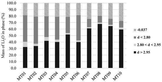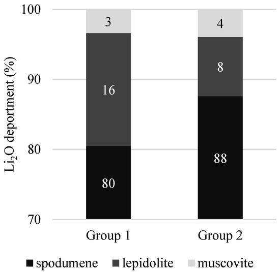 Li deportment was calculated by considering the LA–ICPMS data and relating it to the modal mineralogy obtained by the MLA for each group. The Li content in spodumene was considered theoretical (8.01 wt% Li2O). In the fraction of total +0.037 mm, the Li content in spodumene, lepidolite, and muscovite accounted for 80, 16, and 3% in G1, and 88, 8, and 4% in G2, respectively (Figure 12).