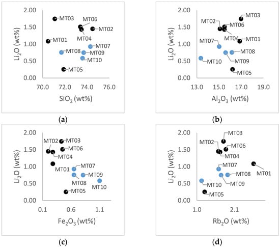 The trends observed in the bulk chemical composition show that samples MT01-MT04 and MT06 have similarities which can be observed in the correlation graphs between Li2O and SiO2, Al2O3, Fe2O3, and Rb2O (Figure 4a–d). Samples MT03, MT04, and MT06 have higher spodumene content (approximately 19%), reaching up to twice as much as the other samples. Sample MT01 has almost twice as much mica (27%) as the other samples.