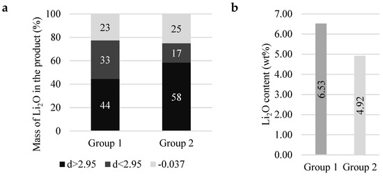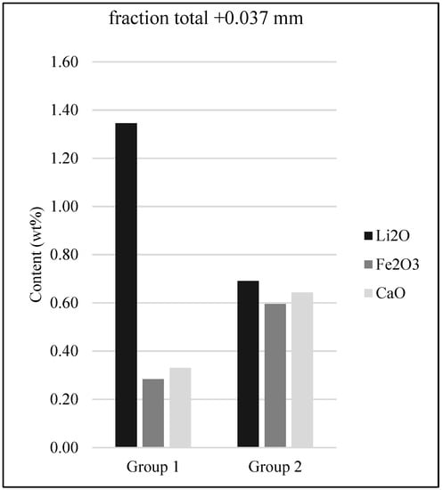 In the fraction of 0.30–0.037 mm, the Li2O contents in G1 and G2 are 1.35 wt% and 0.69 wt%, accounting for 77% and 75% of lithium’s deportment, respectively. The Fe2O3 (0.60 wt%) and CaO (0.64 wt%) contents in this interval are two times higher in G2 than that in G1 (Table 5). Figure 5 illustrates the Li distribution by the sieve size and the Li content in the total +0.037 mm fraction for both groups.