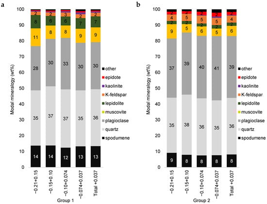 Figure 6 illustrates the mineralogical composition of G1 and G2. Both groups present a similar composition with mainly quartz, plagioclase, spodumene, muscovite, lepidolite, and K-feldspar. G1 has 5% more spodumene, 3% more muscovite, and 5% more lepidolite than G2, whereas G2 has slightly more epidote and other minerals than G1, which include Fe-bearing minerals such as garnet and amphibole. This can be detrimental in the subsequent processing steps as separating Fe-bearing minerals from spodumene can be difficult using DMS or flotation.