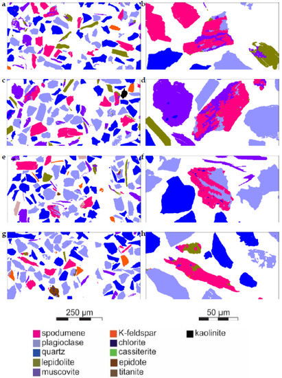 Figure 7 depicts the representative mineral composition maps of the coarser sized fraction (−0.21 + 0.15 mm) and an enlarged view of the spodumene grain relationships with other minerals. G1 and G2 are abundant in liberated spodumene grains, often appearing in a tabular form. Quartz, plagioclase, muscovite, and lepidolite are generally present as gangue minerals. Moreover, K-feldspar is observed in G2 (Figure 7a,c,e,f). The magnified images reveal associations of spodumene grains with plagioclase and muscovite in G1 (Figure 7b,d) and with plagioclase, quartz, and lepidolite in G2 (Figure 7d,h). Muscovite appears to occur mainly along the margins and fractures of the spodumene grains.