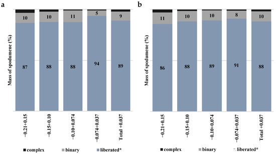 Spodumene liberation characteristics for G1 (a) and G2 (b). Liberation is based on spodumene area (liberated ≥ 95% spodumene). Binary particles are composed of spodumene and another mineral phase, whereas complex particles are composed of spodumene and two or more different mineral phases. *: Grains with ≥95% spodumene in area.