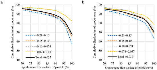 Mineral liberation by free surface area for spodumene in G1 (a) and G2 (b).
