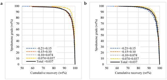 Figure 9a,b illustrate the liberation characteristics of spodumene for both groups in terms of liberated free surface area. Liberation by free surface is important for further processing because it provides information on the surface area available for a leaching solution to reach or a collector/depressant to attach. In general, G2 exhibits slightly higher surface exposure than G1. In the size fraction of total + 0.037 mm, spodumene particles with ≥ 95% of free surface area represent approximately 83% in G1 and 87% in G2. Moreover, higher surface exposure is observed in these particles toward finer size fractions. Only in this size fraction does G1 have slightly higher surface exposure than G2.