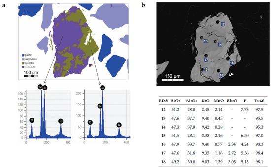 Figure 11a illustrates the SEM-IA mineral composition map of a mica particle comprising muscovite and lepidolite and presents the difference in the EDS spectra between the two minerals. Figure 10b depicts the same mica particle in a BSE image, in which muscovite has a lower grey level than lepidolite. The EDS analysis was performed next to the black spots, which are laser marks from the LA–ICPMS analysis. The EDS table below the image shows that muscovite (points 13 and 14) has, in general, less SiO2 and more Al2O3. Lepidolite also contains more Rb2O and F content.