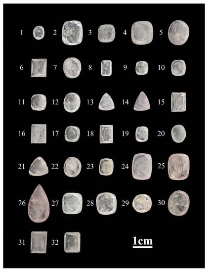 Thirty-two taaffeites from Mogok, Myanmar were selected for examination (Figure 2). All these samples are small, faceted gems with weights ranging from 0.04 g to 0.51 g. The samples were colorless to light pink with translucent and vitreous lusters due to abundant inclusions.