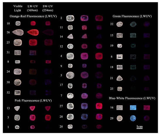 These samples were observed and photographed under visible light and UV light (Figure 3). According to their fluorescence colors under LWUV light, the samples can be divided into four categories: the orange-red, pink, green, and blue-white fluorescence groups. All of them revealed inert to bright pink fluorescence under SWUV light.