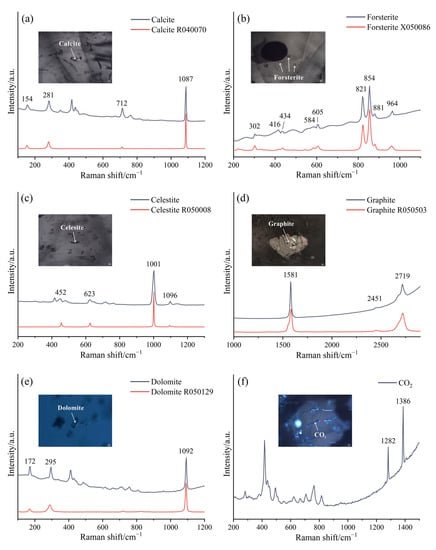 The Raman spectra of inclusions in taaffeite samples. (a) calcite; (b) forsterite; (c) celestite; (d) graphite; (e) dolomite; (f) CO2. Subfigures in each figures indicated the Raman test locations.