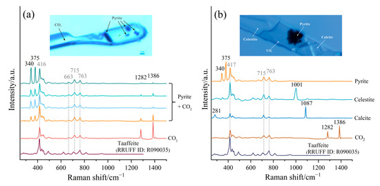 (a,b) Two multi-phase inclusions in sample 2 and their corresponding Raman spectra (the numbers marked as gray are the Raman peaks of the host taaffeite).