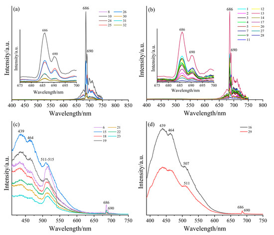 On the right side of Figure 3, the samples presented green fluorescence under LWUV (No. 6, 15, 18, 19, 21, 22, and 23). The fluorescence peaks (Figure 7c) at 439 nm and 464 nm in the blue region are evident in the two-dimensional fluorescence spectra. A peak at 511–515 nm exists in the green region. Additionally, two weak peaks at 686 nm and 690 nm can be observed in the red region.