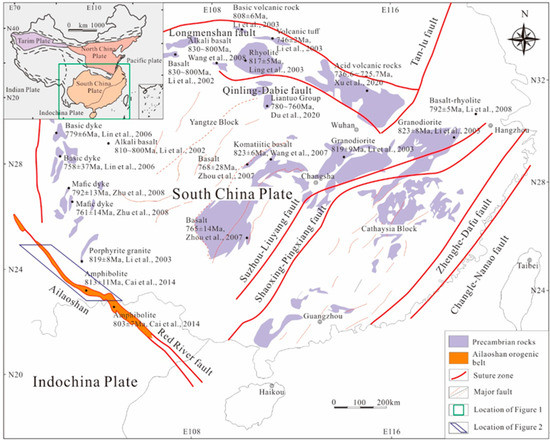 The Rodinia is a supercontinent that existed on the earth in the early Neoproterozoic era, and the breakup of Rodinia is one of the hot topics in global tectonic and Precambrian geological research. The concept of Neoproterozoic ‘Rodinia’, proposed by McMenamin and McMenamin [1], was a global supercontinent formed by continental collision before 1.00 Ga. Previously, researchers have achieved great achievements in paleomagnetism, magmatic rocks, isotope chronology, stratigraphy, and so on. Hoffman [2] established a supercontinent reconstruction map based on paleomagnetic data. Paleomagnetic data indicated that Rodinia was formed in the late Mesoproterozoic era, during the formation of the global Greenwell orogenic belt at 1.10 Ga, through the mutual collage of ancient cratons [3,4]. Isotopic chronological data indicated that the collision among the East Antarctic Craton, other Australian cratons, and the Gawler Craton occurred at 1.50–1.55 Ga and Australia entered the initial collage period [5,6,7]. Li et al. [3,4] proposed that the South China Plate (Yangtze and Cathaysian) was located between the Australia and Lauren continents based on the geochronological and stratigraphic data of the orogenic belt, which is the bridge connecting North America and the Australia–Antarctic continent and the core of Rodinia.
