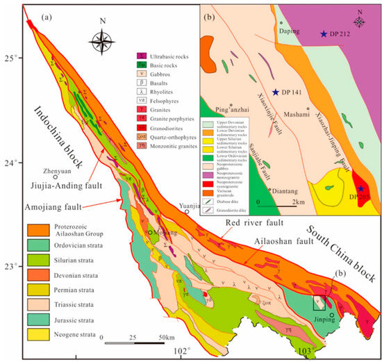 - Zhang, Y.Y.; Liu, K.; Wang, Y.; Zhang, D.; Mo, X.X.; Deng, Y.F.; Yu, T.X.; Zhao, Z.N. Geological significance of Late Permian magmatic rocks in the middle section of the Ailaoshan orogenic belt, SW China: Constraints from petrology, geochemistry and geochronology. Minerals. 2022, 12, 652. [Google Scholar] [CrossRef]