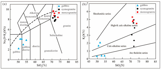 Classification and discriminant diagrams of magmatic rocks. (a)—SiO2 vs. K2O+Na2O plot of intrusive rocks [42]; (b)—K2O vs. SiO2 plot [42].